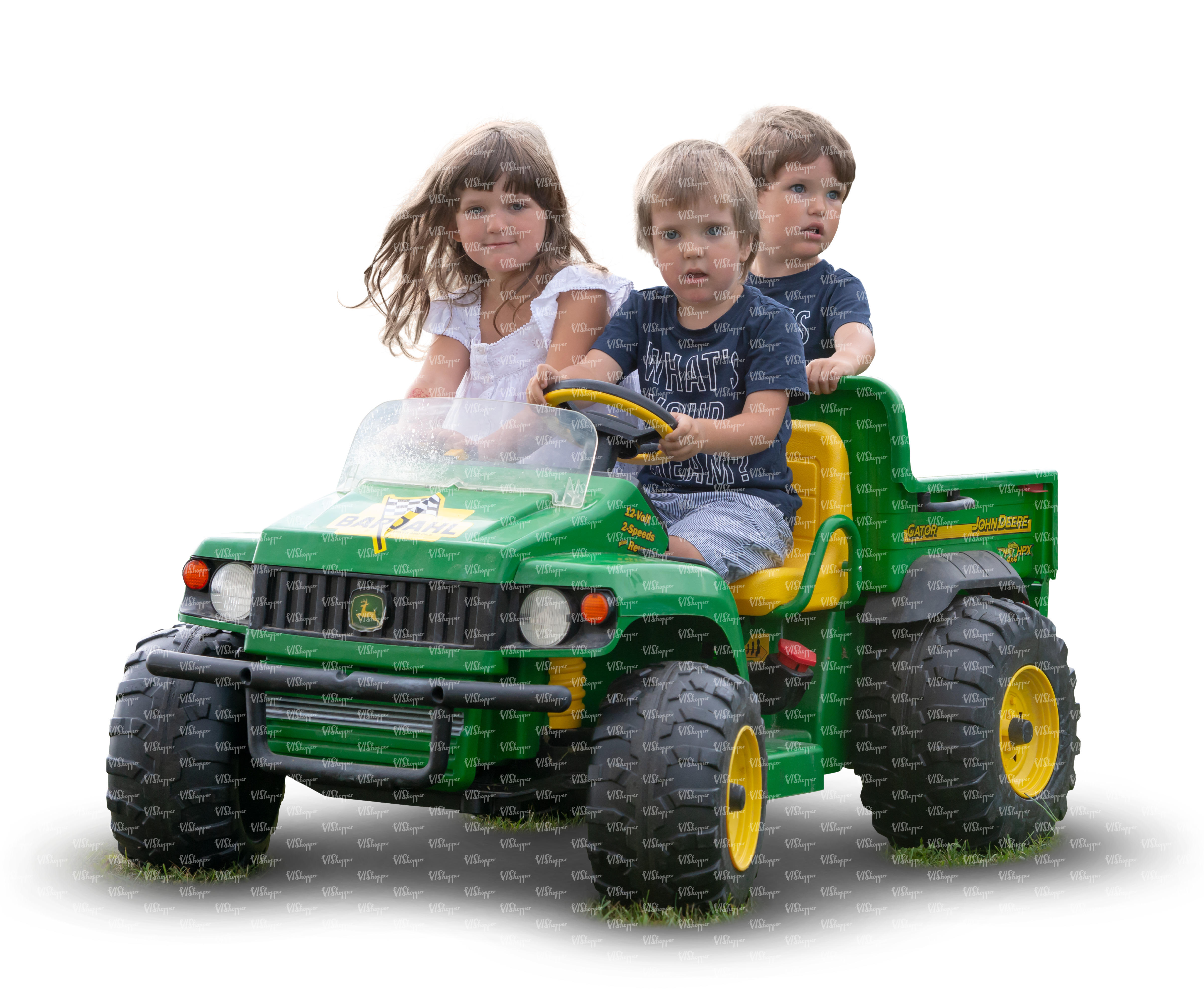 • three children riding a toy car