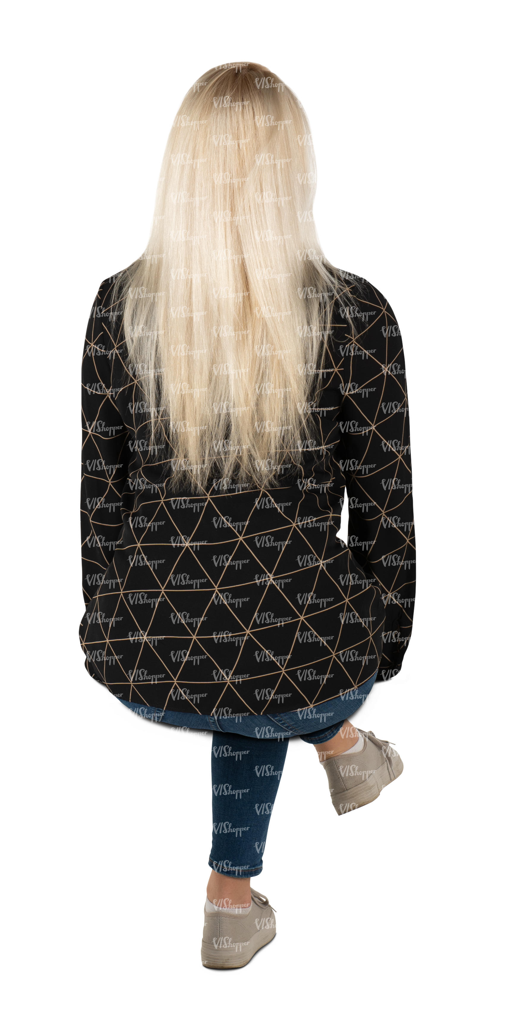 • cut out elegant woman in a black and white dress walking
