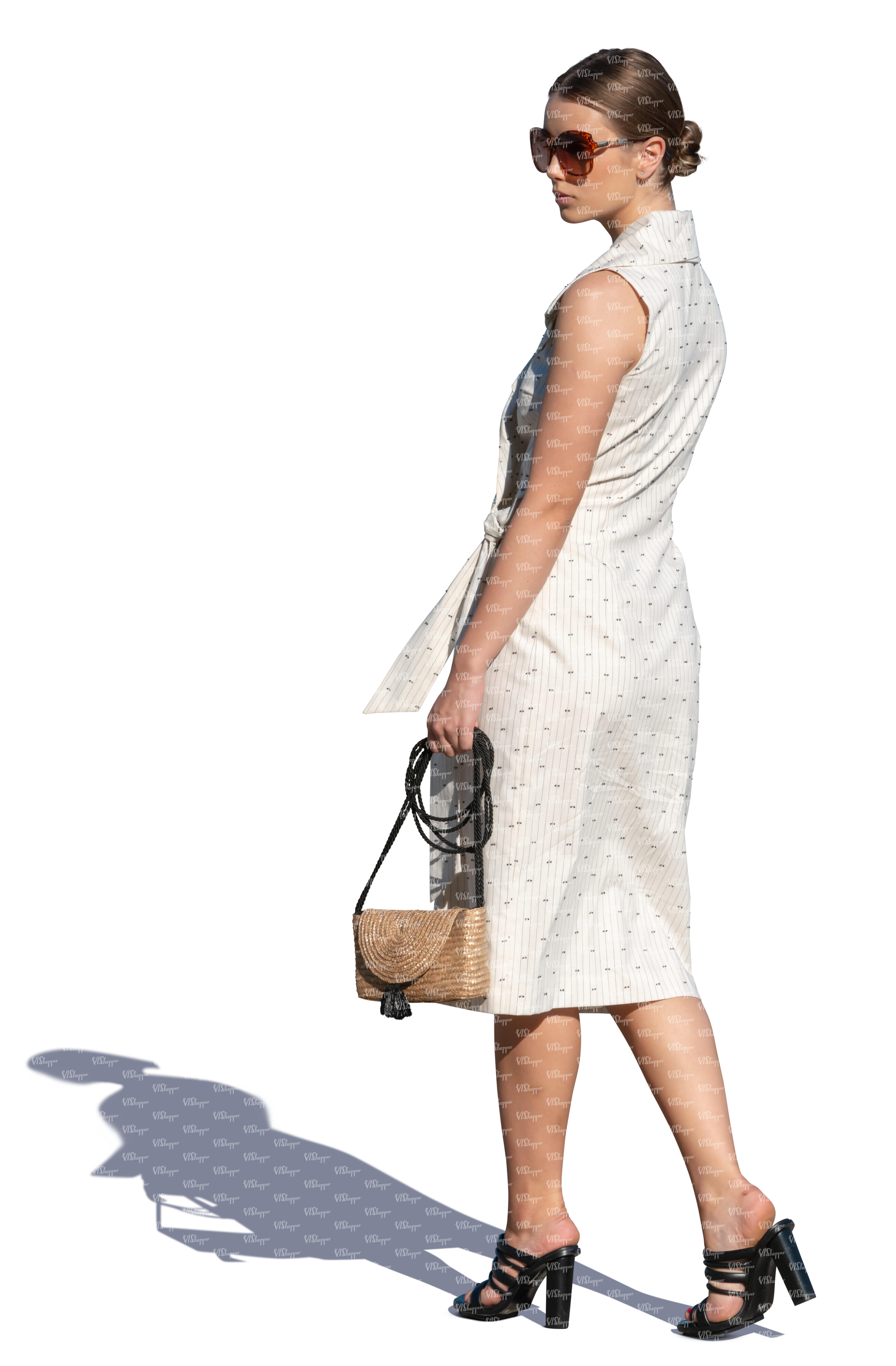 • cut out woman in a white beach dress walking in backlight