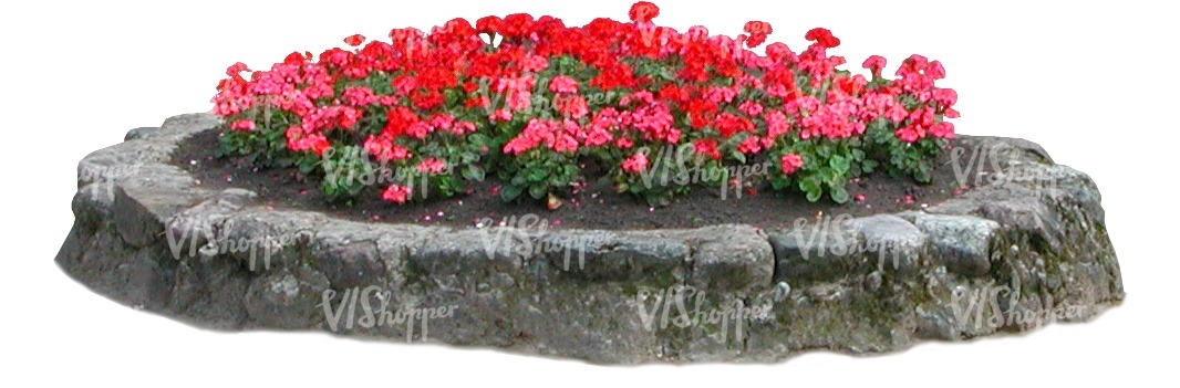 • round red flowerbed with stone edging